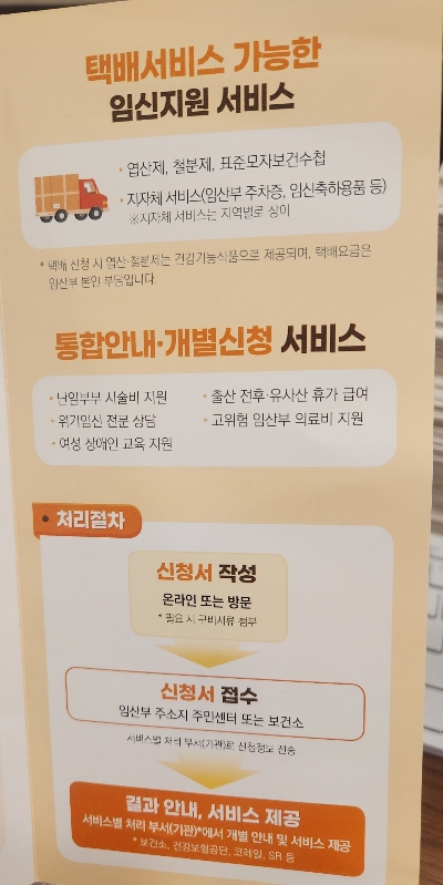 - 현물 지원: 신생아용품, 튼살크림, 비타민, 임산부 주차증 등